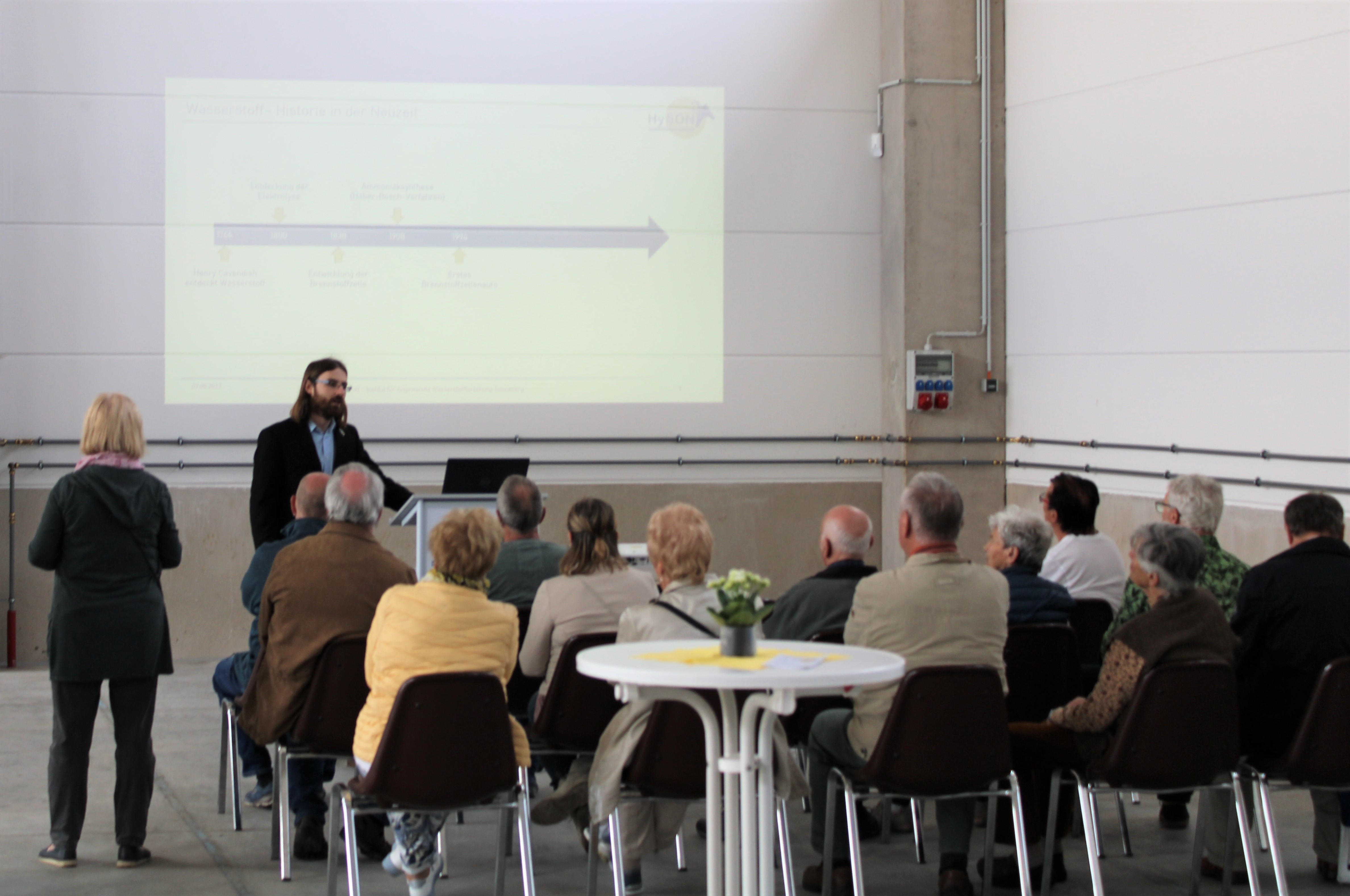 Den Besuchern wurde hierbei ein buntes Rahmenprogramm geboten. So konnten die Besucher in regelmäßigen Abständen einem kurzen Einführungsvortrag zum Thema Wasserstoff lauschen. In diesem wurde neben Grundlagen zum Thema Wasserstoff und dessen Einsatz auch auf die Wichtigkeit der Wasserstofftechnologie für zukünftige Herausforderungen im Bereich des Klimaschutzes eingegangen.